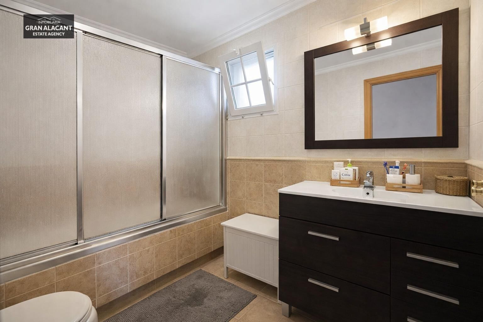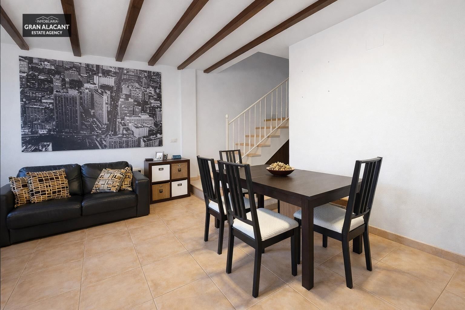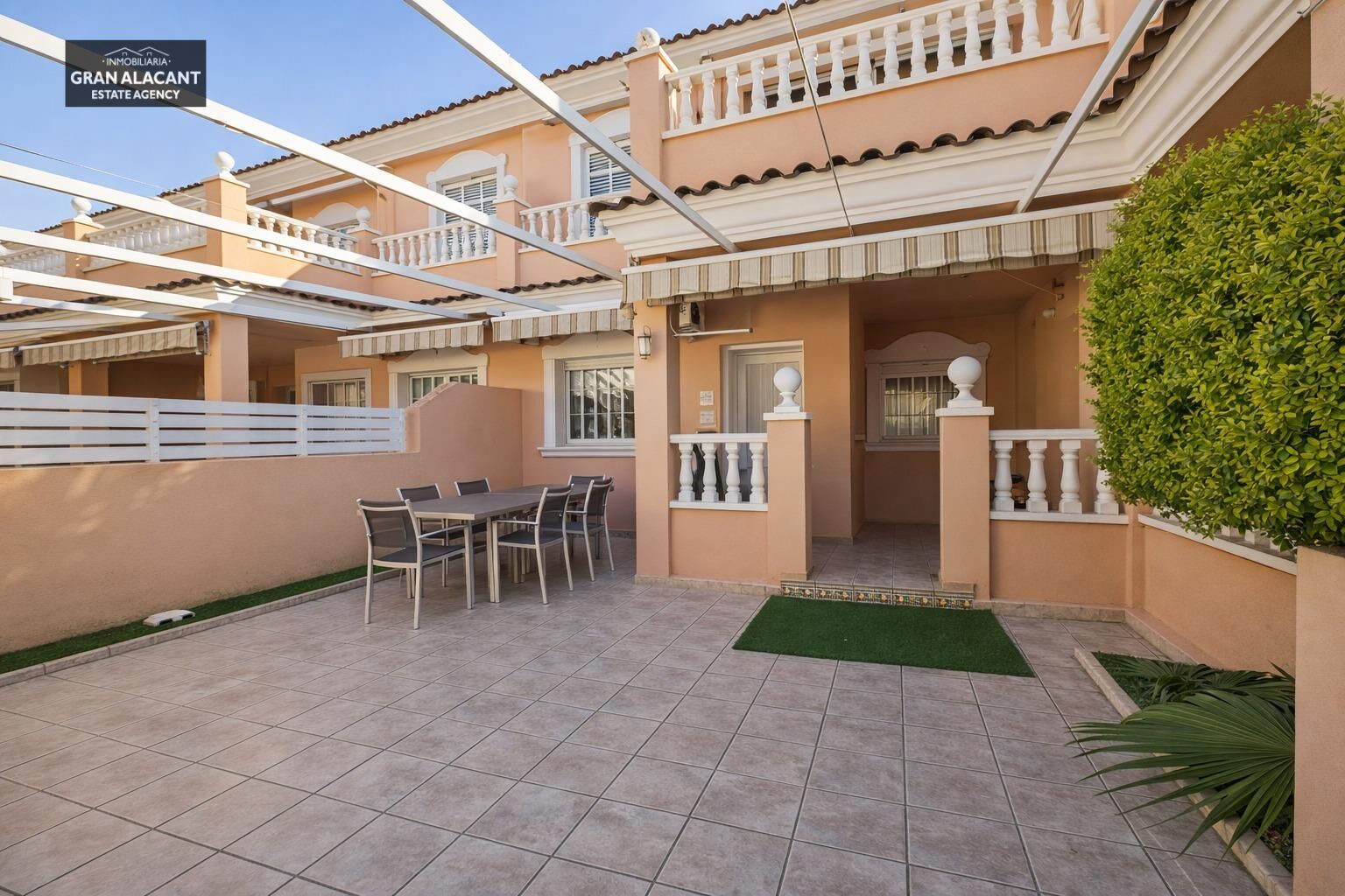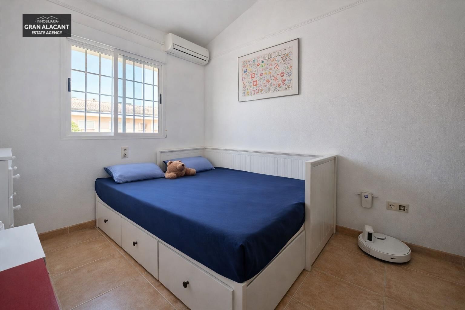 Gran Alacant has become one of the most sought-after residential addresses on the southern Costa Blanca — and this two-storey bungalow in the Mediterráneo urbanisation illustrates exactly why. A gated, private community with two swimming pools and tennis courts, parking practically at your front door, 900 metres to the beach, and 10 minutes to Alicante International Airport. It's a combination that's harder to find than it sounds.